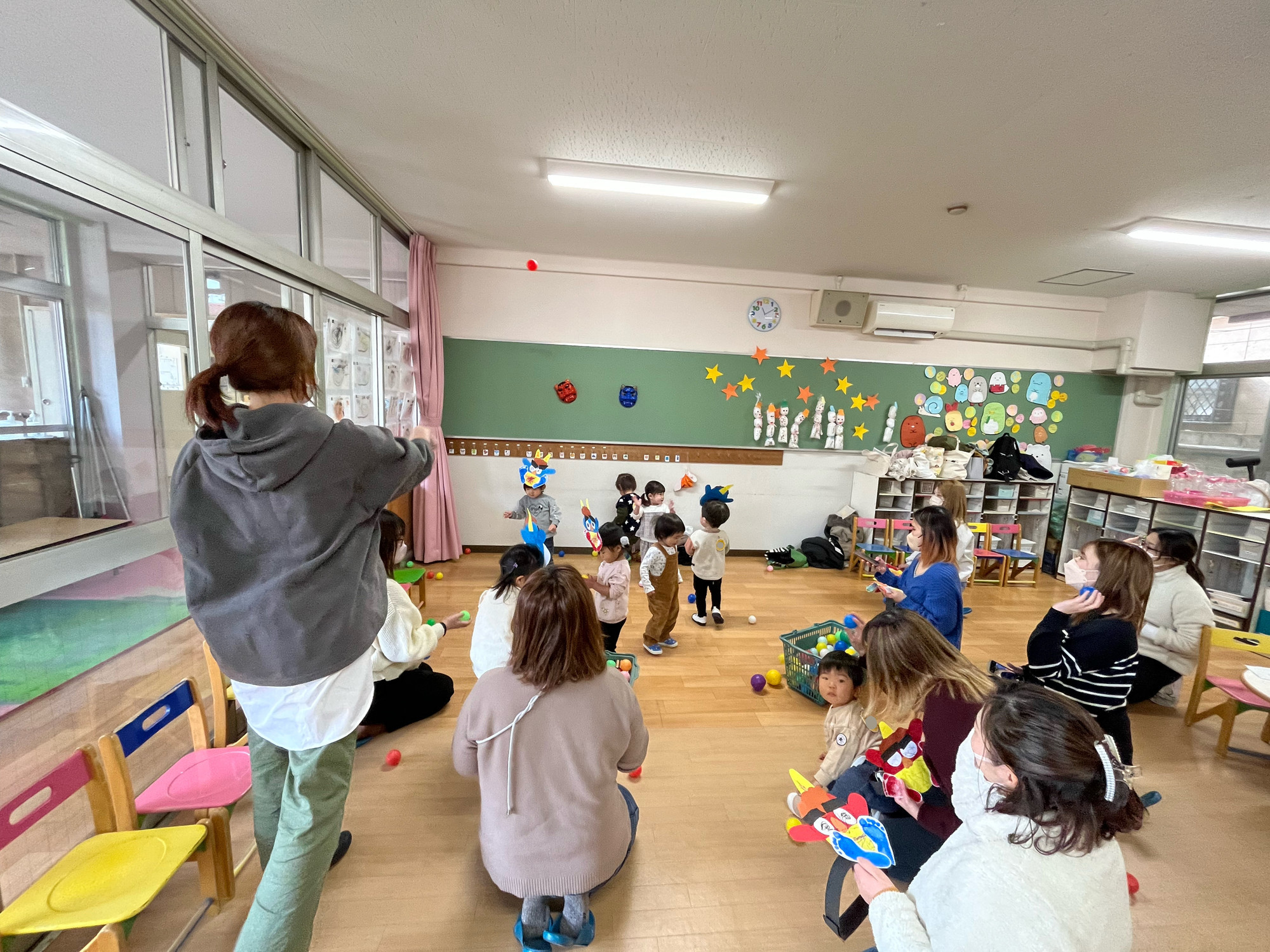 壁の鬼に向かって豆の代わりのボールを投げます。
