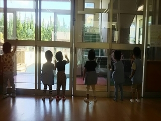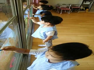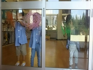 ガラスにお絵描き(^^♪ (キャンディークラス) 2019/09/19 今日はキットパスで、保育室のガラスにお絵描きしていきましたよ(^u^) みんな、いつもと違って、ガラスで透けている中に描くので、夢中になっていましたよ☆ グルグル・にょきにょき・くねくね みんな笑顔でかいてくれました☆