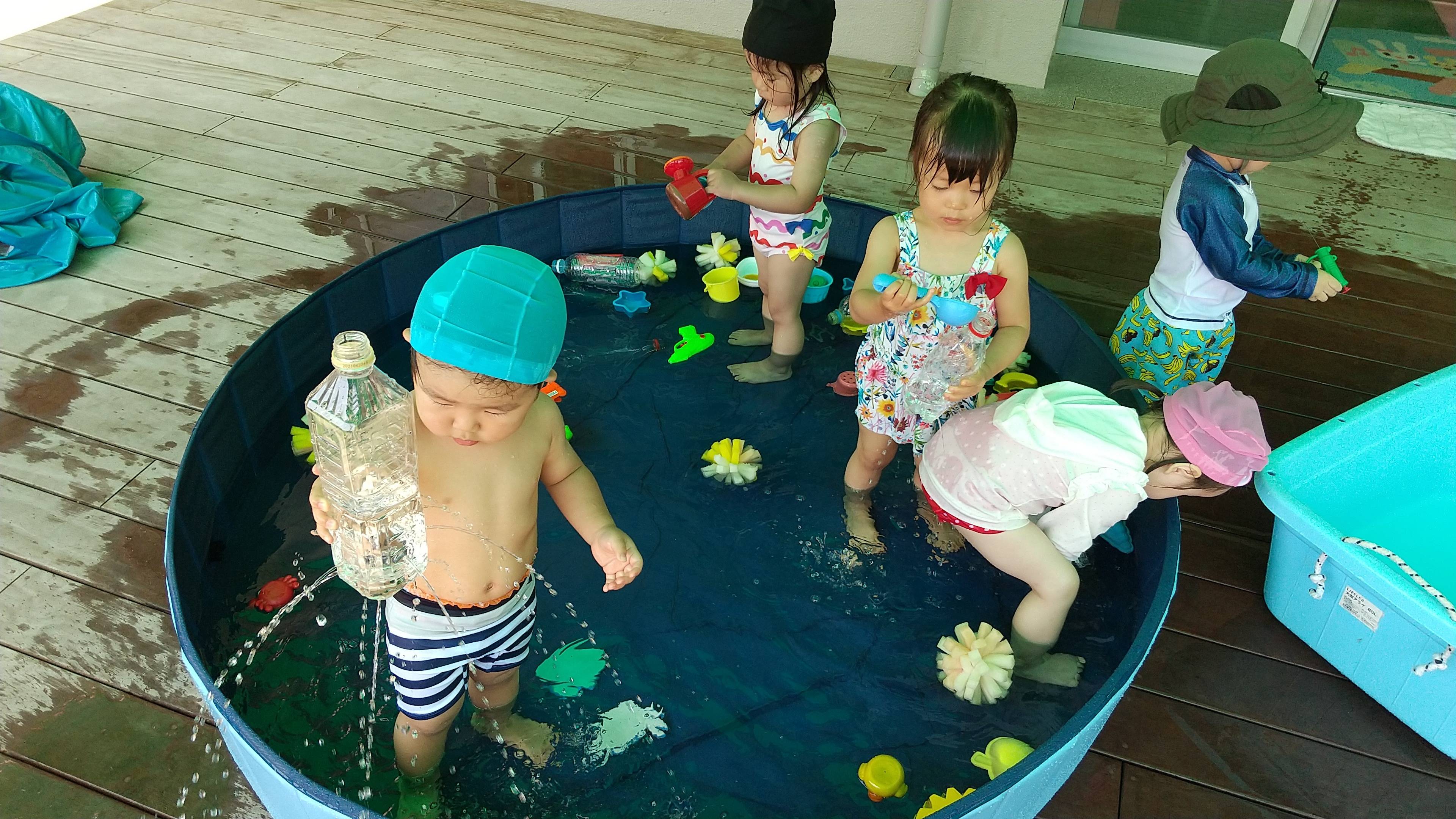 キャンディクラスプール遊びをしました! 2020/06/29 今日はプール遊びをしました! 慣れるまで泣いてしまうお友だちもいましたが水鉄砲やボール、ペットボトルで作ったシャワーなどを使って思い思いに遊んでいました!シャワーも怖がらずに浴びていて、楽しめたようで良かったです(*^^*) かたつむりの時計制作も完成しました!