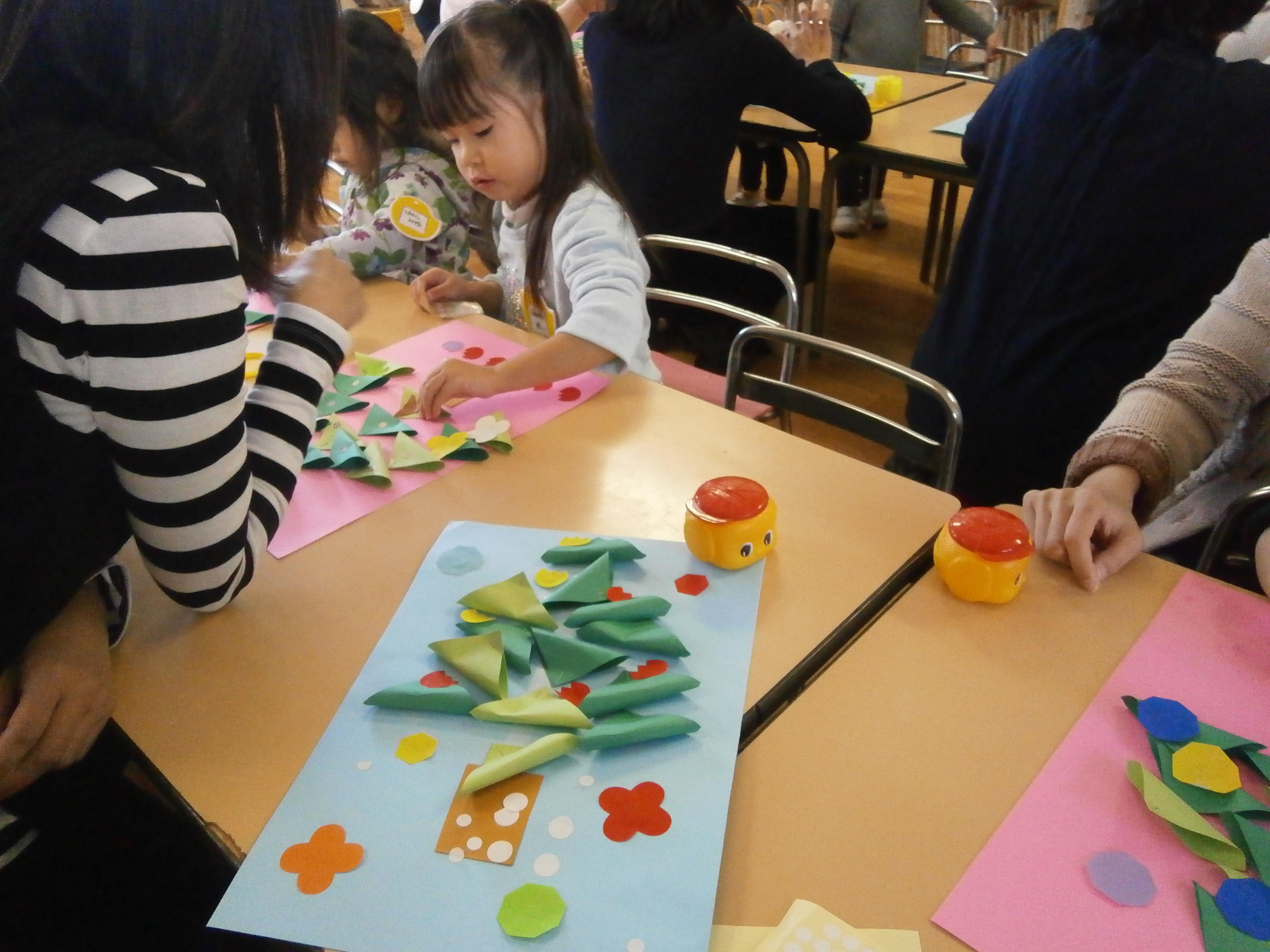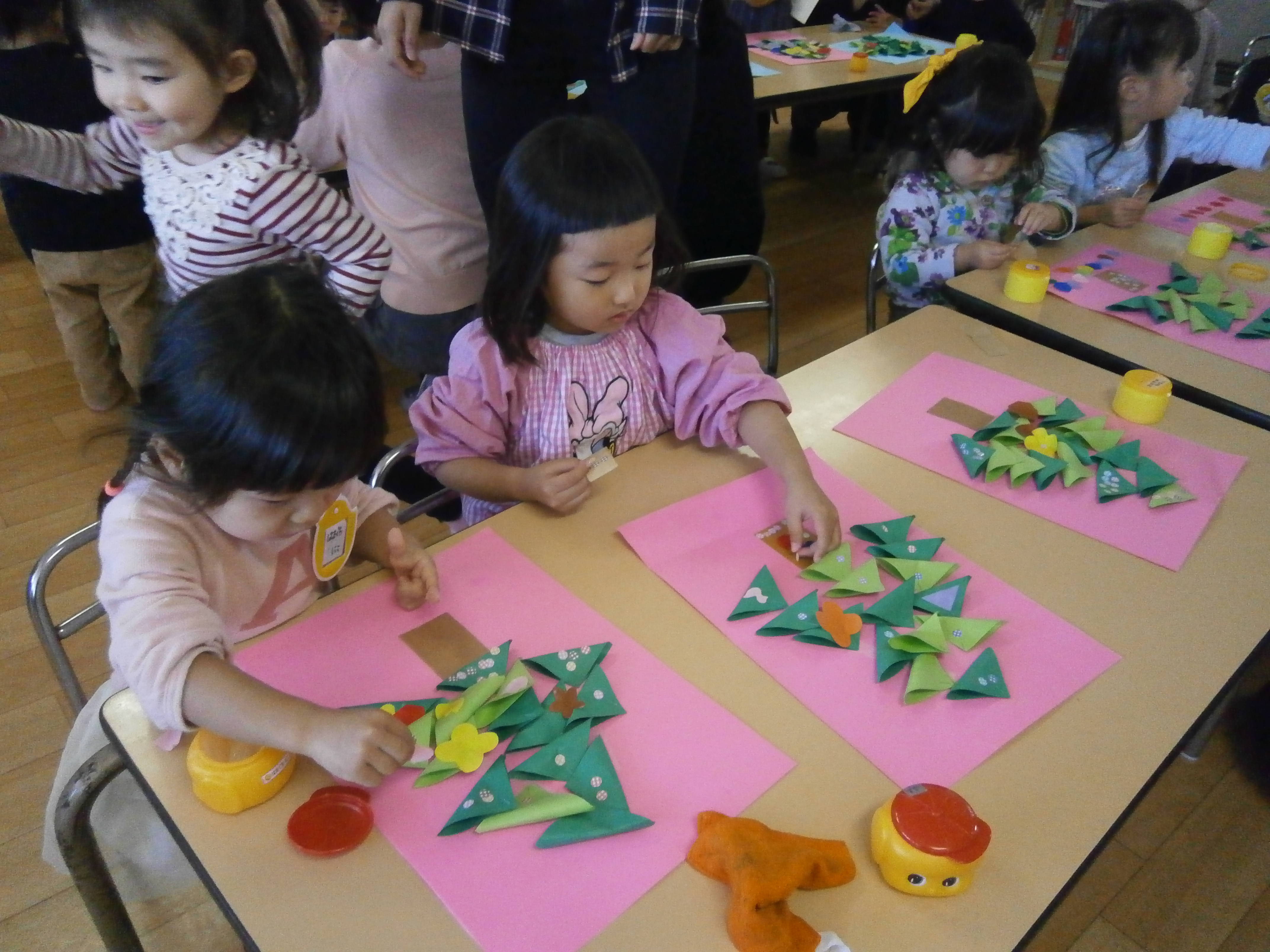 クリスマスはもうすぐだ(●^o^●) (ぴよちゃん 木下) 2017/12/08 今日はみんなで、クリスマスツリーを作っていきましたよ(*^_^*) 両面テープを魔法のテープと伝えると、子ども達は興味津々!!!! 両面テープのシールを剥がして、三角のはっぱを付けていきましたよ(●^o^●) その後は、好きな飾りを5つずつ選んで貼る、を繰り返し、シールで雪を降らせていきましたよ☆ みんな段々と集中力がつき、意欲的に製作してくれるのがうれしいです☆ いろんな場面で、子ども達の成長を感じています☆