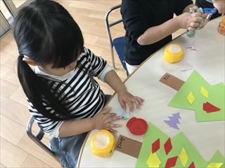 のりを使って、クリスマスツリーに飾り付けをしていきました☆