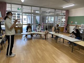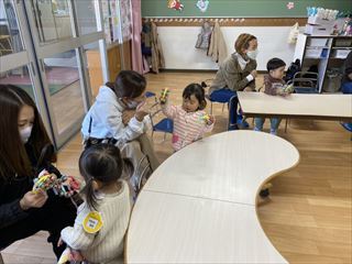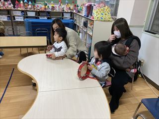 今日はタンバリンやスズ、カスタネットを使って楽器遊びをしましたよ。