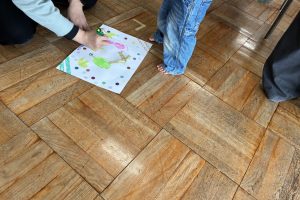 いよいよ手型・足型スタンプです。インクの感触にびっくりして泣いてしまう子もいましたが、ママと一緒に「ぺたっ」と上手にスタンプすることができました。