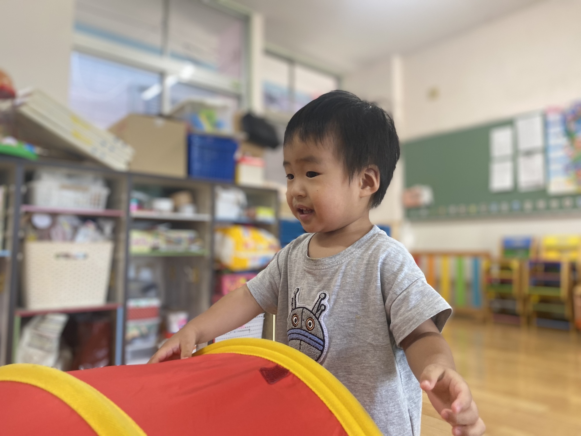 やっぱり、お母さんと離れるのは不安だよね。泣いてもいいよ。でも、先生たちと遊んで楽しくなったら、にっこり笑ってね。