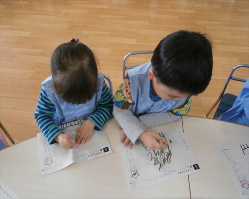 始めは、点やぐるぐる描きの子もいましたが、少し声かけをすると画用紙いっぱいに大きな丸が描けていました。