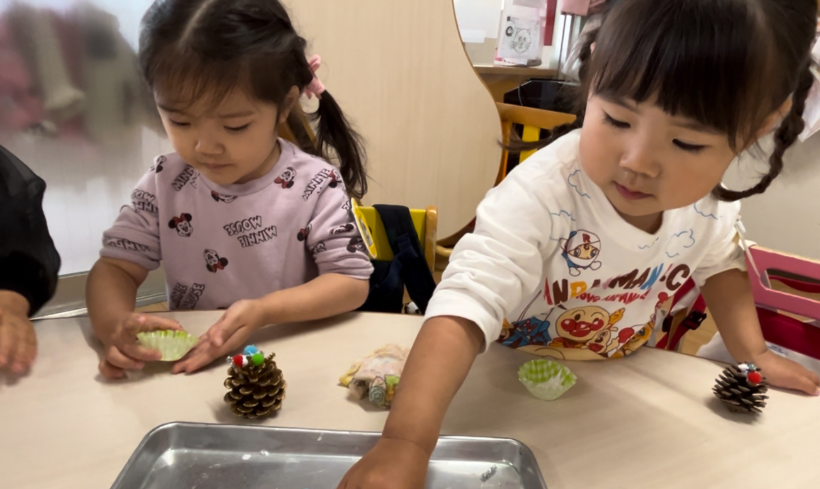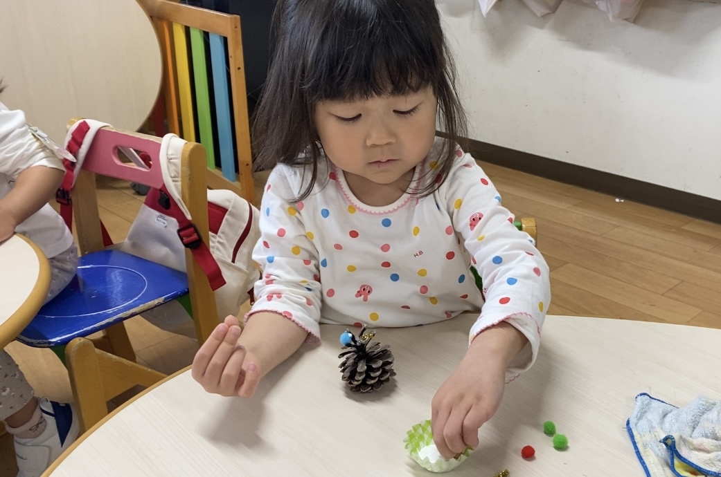 クリスマスのお歌を歌ったり、まつぼっくりでミニミニクリスマスツリーを作りました!