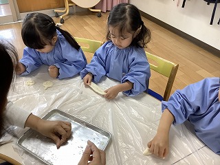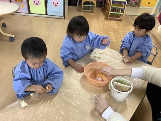 小麦粉粘土にチャレンジしました(*'ω'*)さらさらの粉を見て、興味津々のこどもたち!!