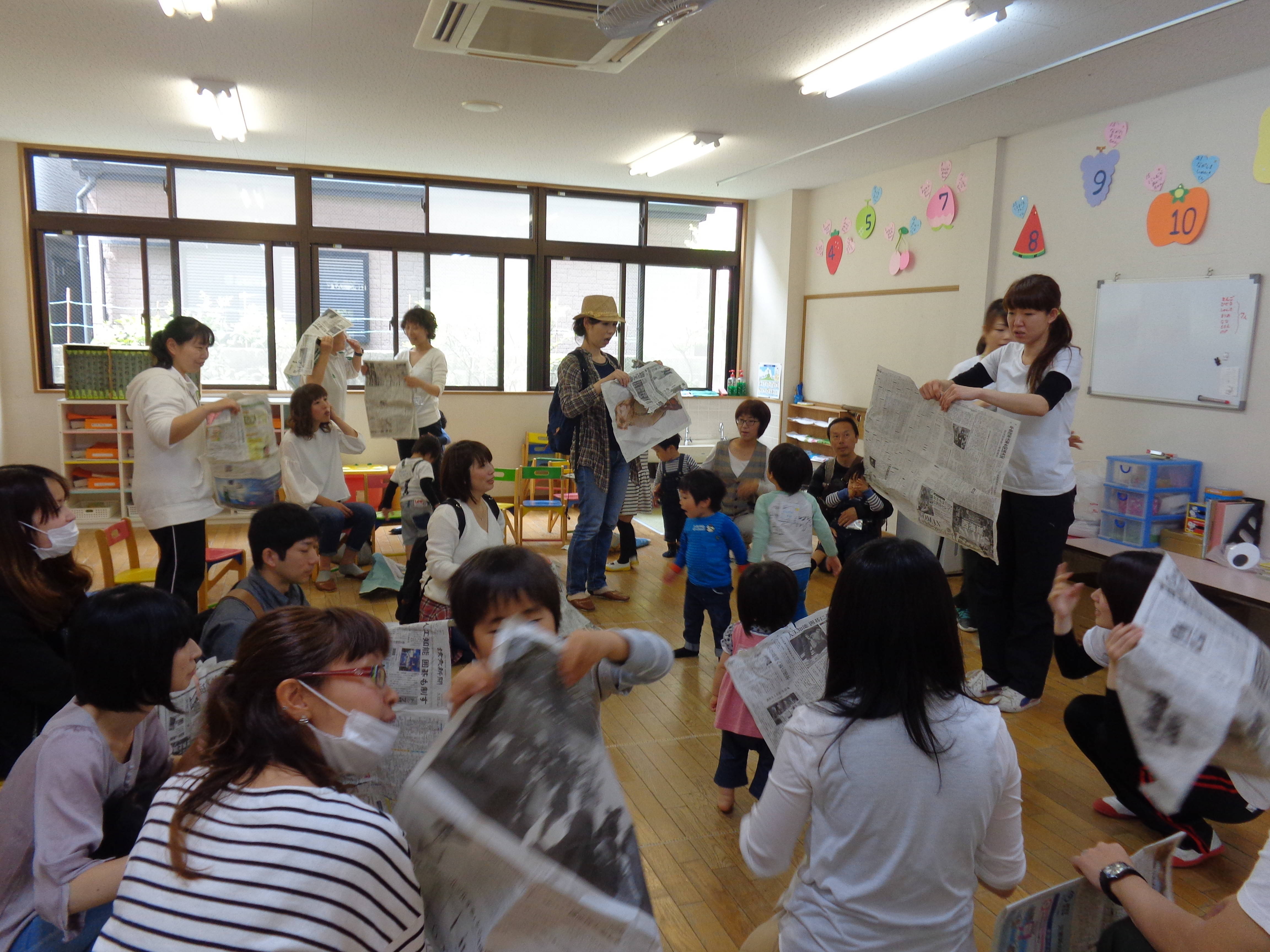 先にお部屋で新聞遊びと触れ合い遊びをするグループ