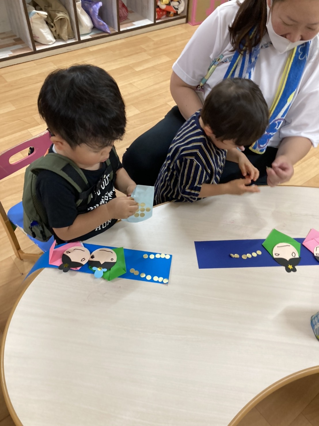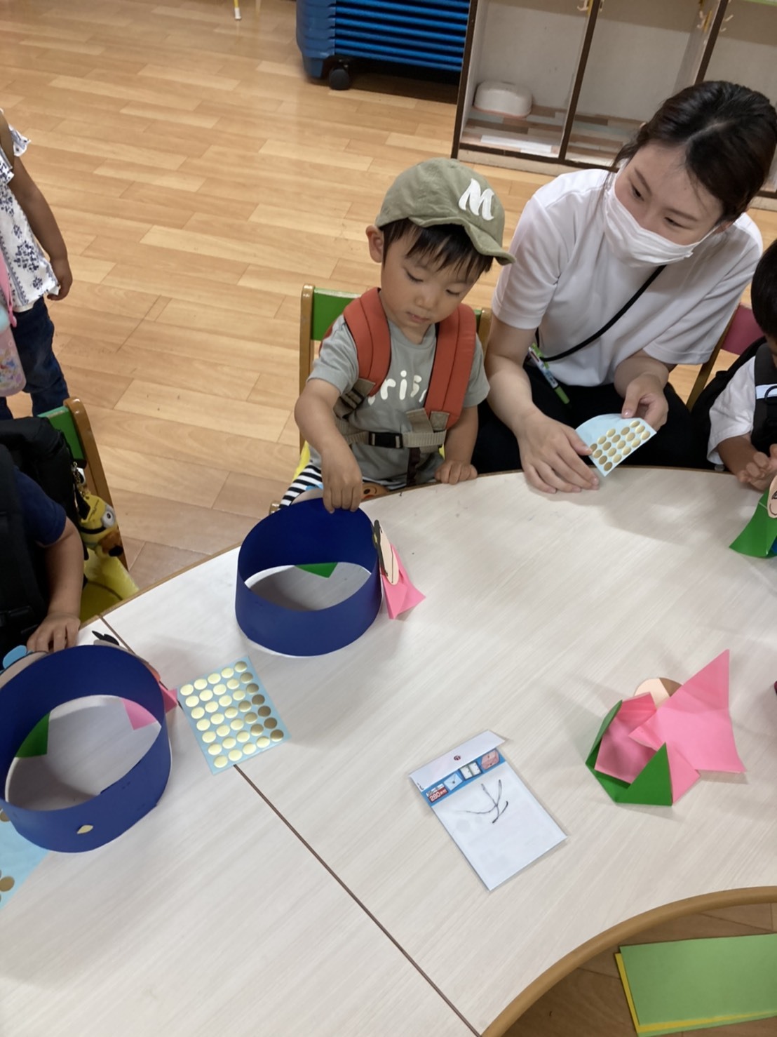 スマートキッズのカードをしたり、七夕の飾りをお母さんと一緒に作りました。