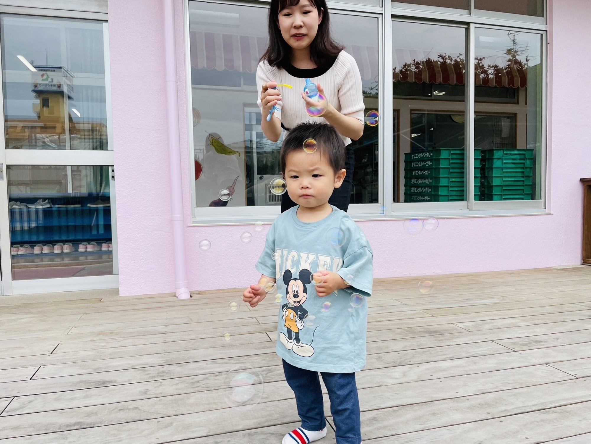 お母さんが吹いてくれたシャボン玉をじっと見て、なんだろう?と不思議な顔。