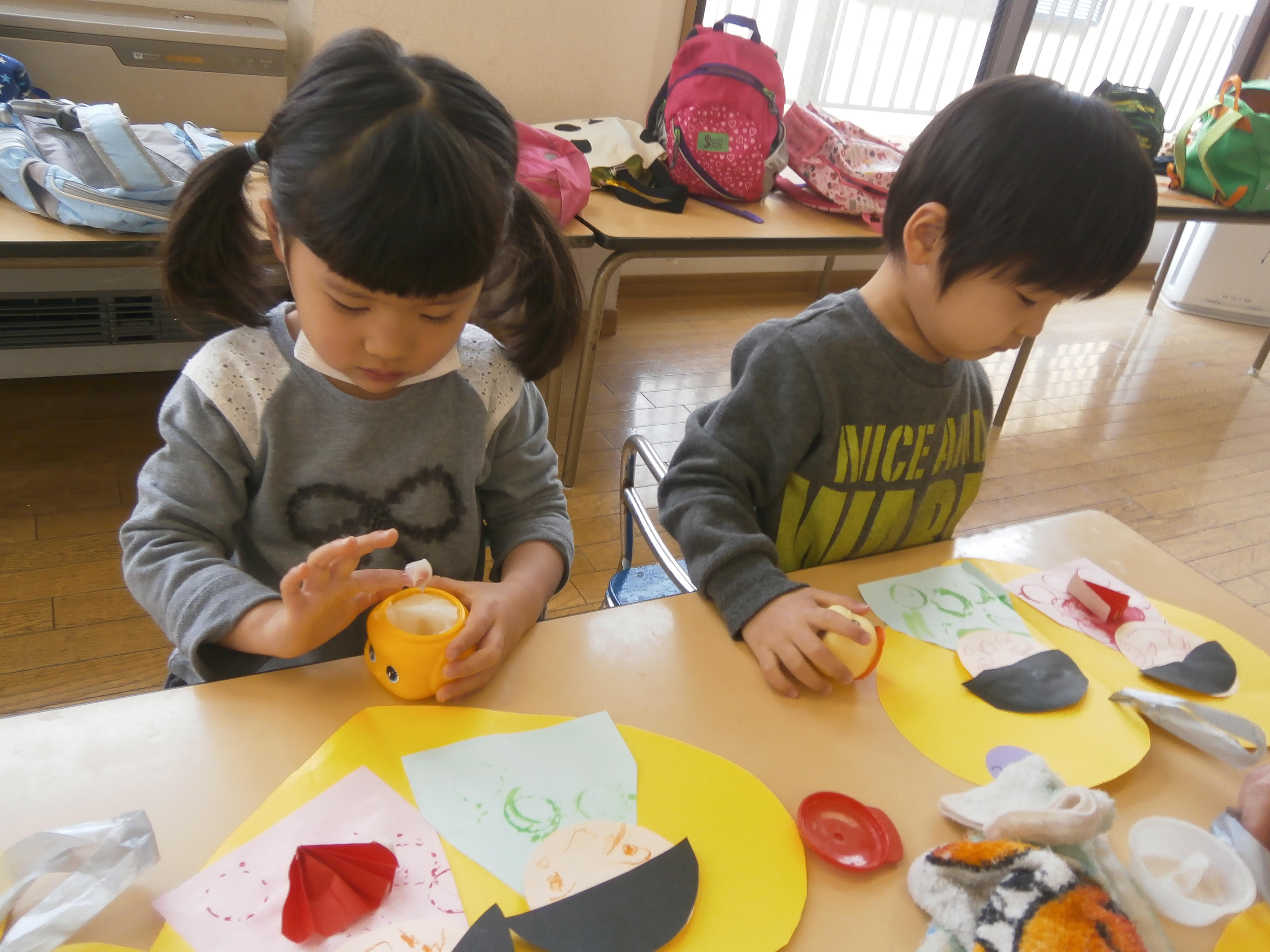 クレパスで顔を描いたり、のりを使って顔や着物を
