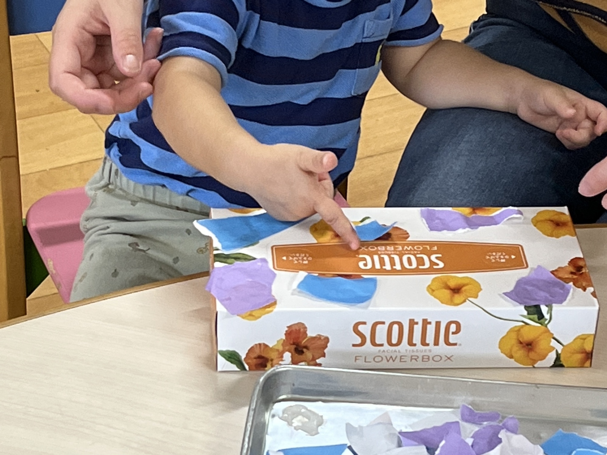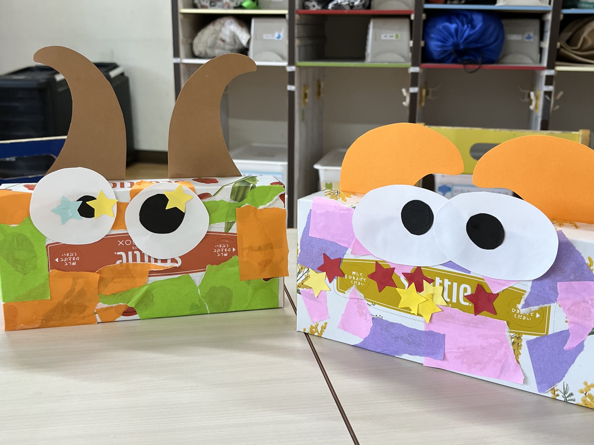 最後は、ちぎった色紙を使って、ティッシュBOXをモンスターに変身させました。