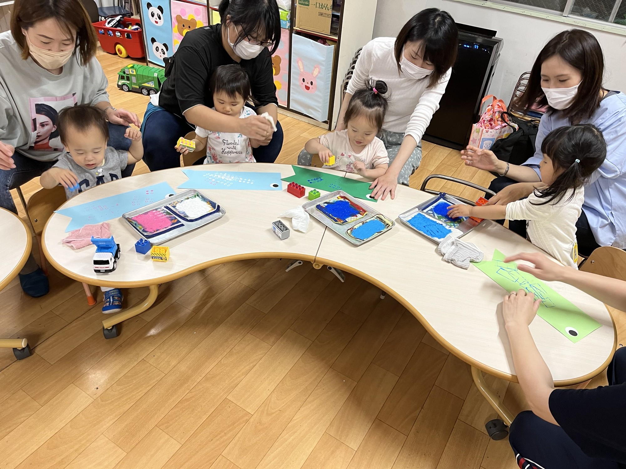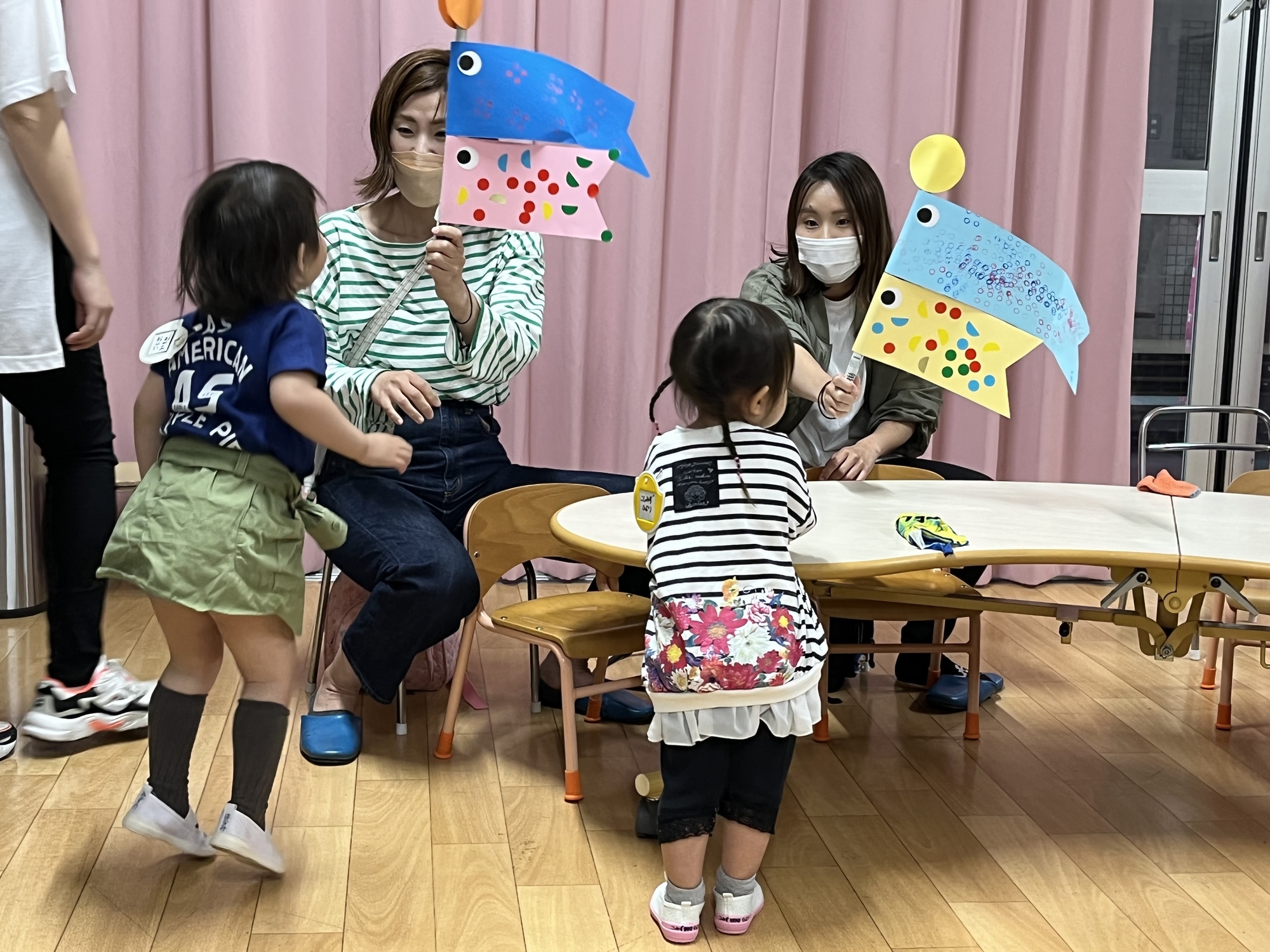 絵の具でスタンプしたり、シールをペッタン貼ったのをお母さんに棒に貼ってもらって出来上がりー。