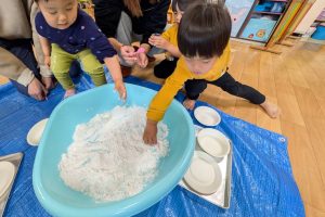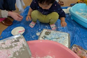 最初は指だけで触っていましたが、こちらの様子を見て、手の平全体で触ったり、かき混ぜたり・・・