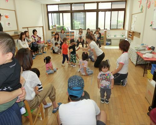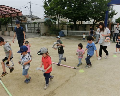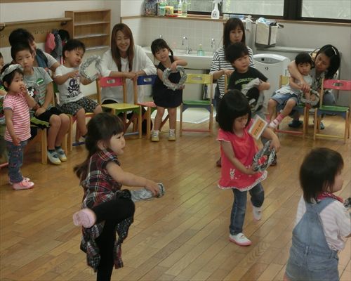 歌に合わせて自分のハンドルを持ち、お部屋や園庭を