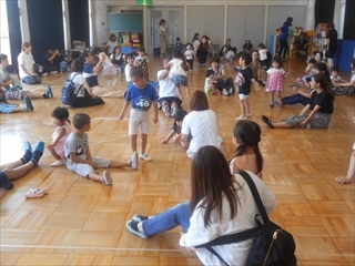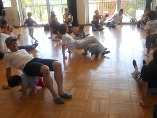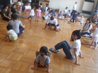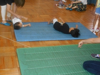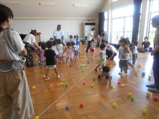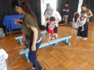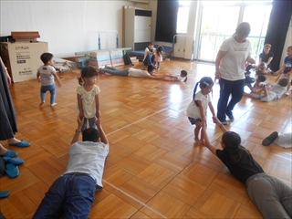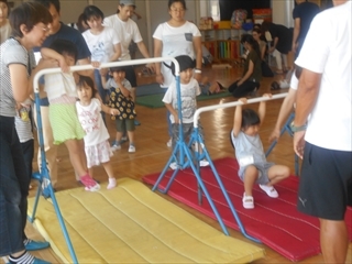マットや鉄棒、ボールなどを使って走ったりぶら下がったりなど、