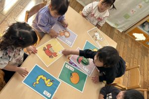 カルタとりは、つぼみさんならではの「カエルさんどーれだ?」の問いかけに「これ!」と手で押さえる遊び方です(o^^o)何回か繰り返す事でコツを掴んだ子ども達は、夢中になってカルタとりを楽しんでくれていました(๑>◡<๑)
