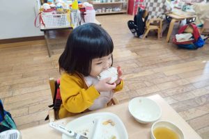 - 1月20日(月)は、つぼみ組さんのおにぎりdayでした。給食のおかわりでも大人気のおにぎり♡お椀にラップを敷いてもらって、自分でぎゅっと握りました。