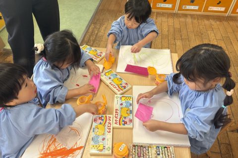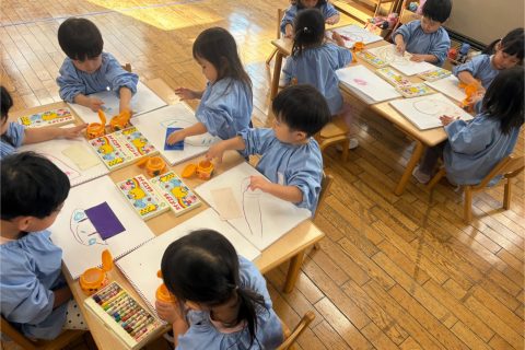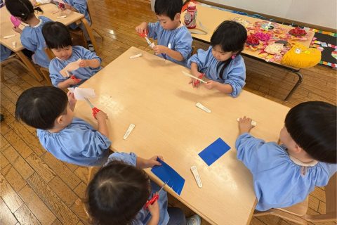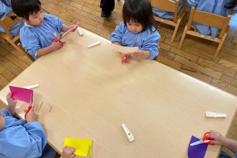 「できてる?」「難しい〜、、」と言って苦戦している子もいましたが、保育者と一緒に最後まで頑張ってくれていましたよ♪はさみを使った後のお片付けも完璧◯