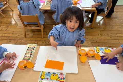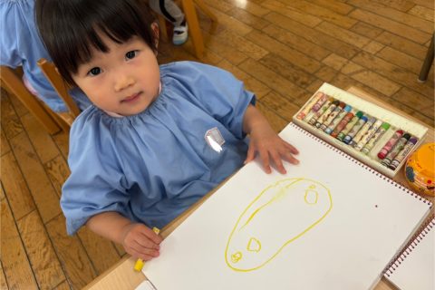 次に、大きな丸を書いておめめとお鼻とお口!中には、ほっぺたを書いているお友達もいましたよ。お顔も描くのがどんどん上手になってきました!♪