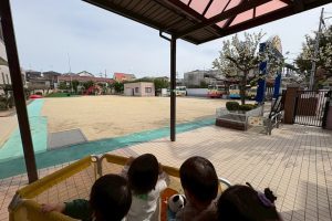 つぼみ1組さんは部屋からカートに乗り、園庭へお散歩を楽しみました。