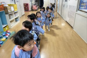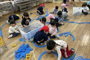 つぼみ2組は今週からお昼寝もなくなり、お兄さん、お姉さんと同じ遊びを一緒にさせてもらい新学年に向けて体を慣らし中です。